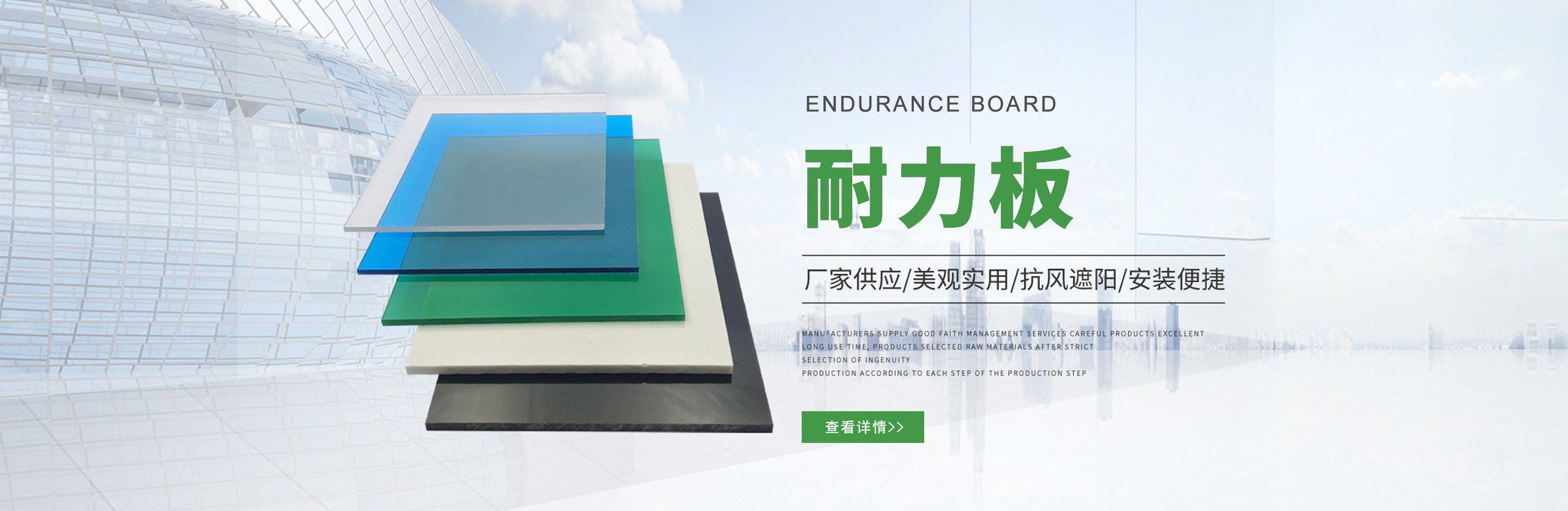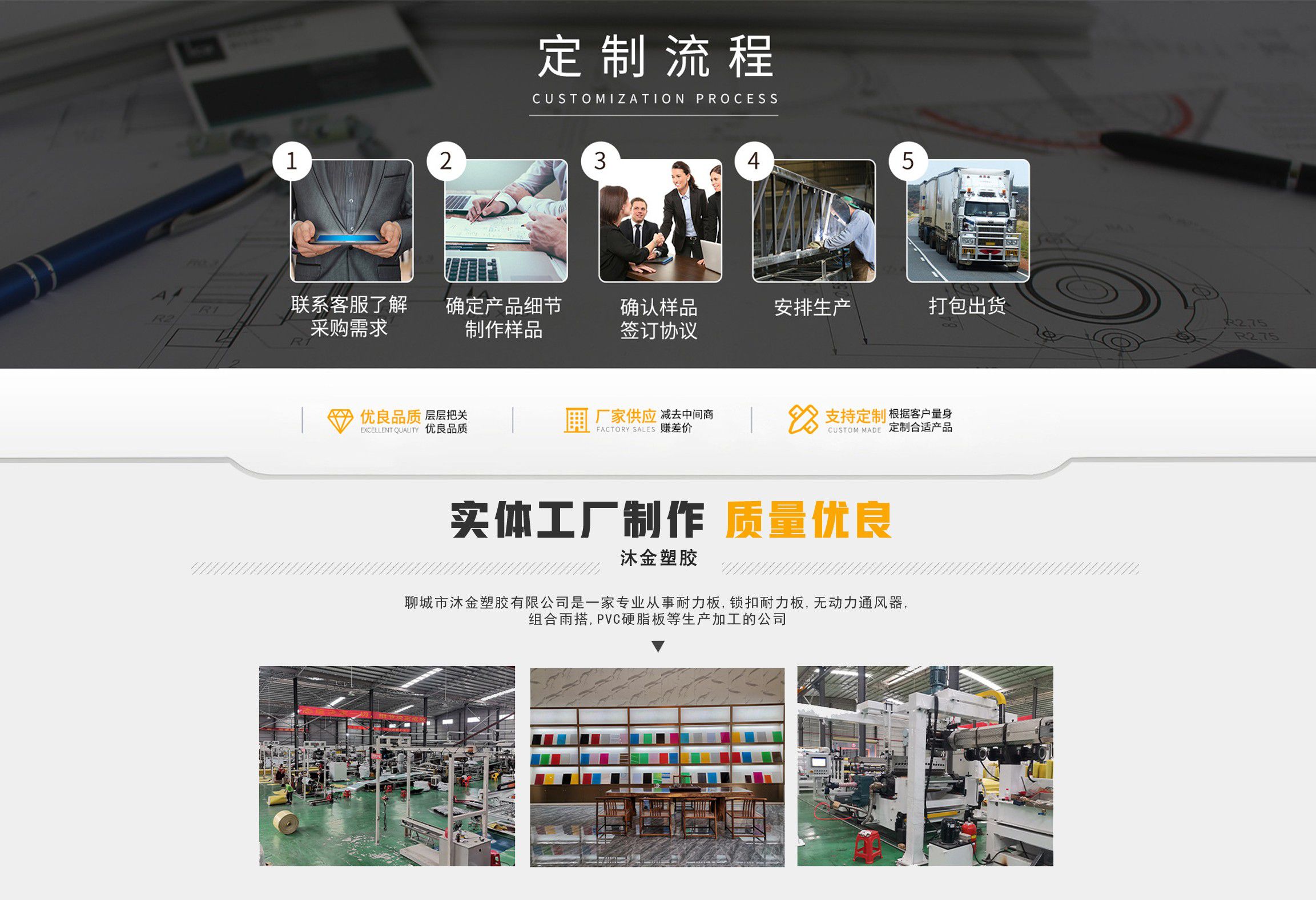 聊城市沐金塑膠有限公司注冊資金2180萬元,占地20000余平方,擁有自建廠房15000平方,員工100余名。10余年來,公司主營耐力板,鎖扣耐力板,耐力板深加工,無動力通風器,組合雨搭,PVC硬脂板,耐力板廠家等板材的發(fā)展戰(zhàn)略,逐漸成長為綜合性企業。 公司擁有多條板材共擠生產線,采用世界知名品牌進口原材料和先進工藝,依據完善的ISO9001質量管理體系和ISO14001環(huán)境管理體系,為產品的卓越品質提供了強有力的保證。憑借過硬的創(chuàng)新能力和堅實的硬件基礎,贏創(chuàng)已成為國內領先的熱塑性板材生產商,產品被廣泛應用于建筑業、農業、工業、廣告業、安防行業及DIY領域。 公司始終致力于通過提供最優(yōu)的板材應用解決方案,為客戶創(chuàng)造最高的價值;堅守創(chuàng)新、質量、靈活、服務和速度的核心價值觀;堅持“完美的產品需要完美服務的支持”的經營理念,努力實現成為世界領先的板材與解決方案供應商的夢想。 在未來,公司將立足客戶需求,不斷改變和完善現有產品,拓展產品線和充分開發(fā)板材的應用領域,為客戶創(chuàng)造全方位的價值。同時更好地實現員工的價值,實現公司團隊的價值。我們將與您一起創(chuàng)贏未來! 企業使命:成為世界領先的板材與解決方案供應商。 公司愿景:通過提供最優(yōu)的板材應用解決方案,為客戶創(chuàng)造最高的價值。 核心價值觀:質量...